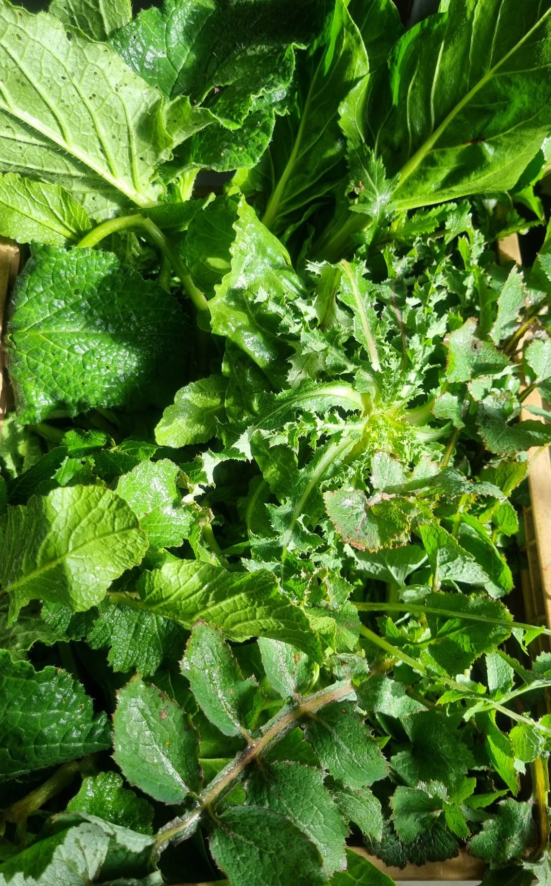 Mix di erbe spontanee, raccolte direttamente nei nostri campi, costituite da . Borragine, tarassaco, crespino, bieta selvatica, broccoletto selvatico.