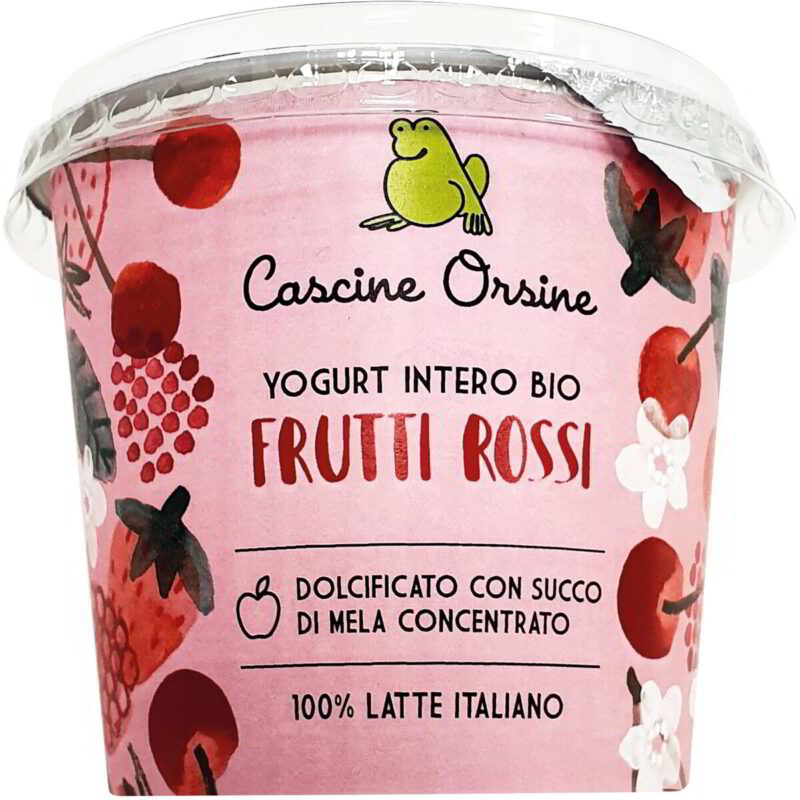 Ingredienti: Yogurt intero* (latte intero*, fermenti lattici vivi: L. bulgaricus, S. thermophilus), semilavorato ai frutti rossi* 23% (succo di mela concentrato* 57%, fragola in pezzi* 14%, amarena in pezzi* 12%, lampone in pezzi* 10%, acqua, amido di tapioca*, succo di limone concentrato*, aroma naturale, gelificante: pectine). (*da agricoltura biologica)